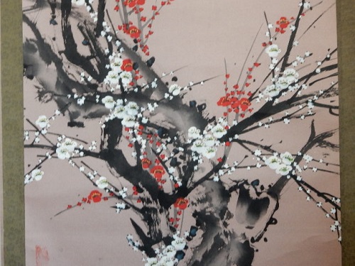 こちらは掛け軸です。紅白の梅を描いた日本でも縁起の良い墨彩画です。お正月には是非床の間に掛けてみたいですね。
